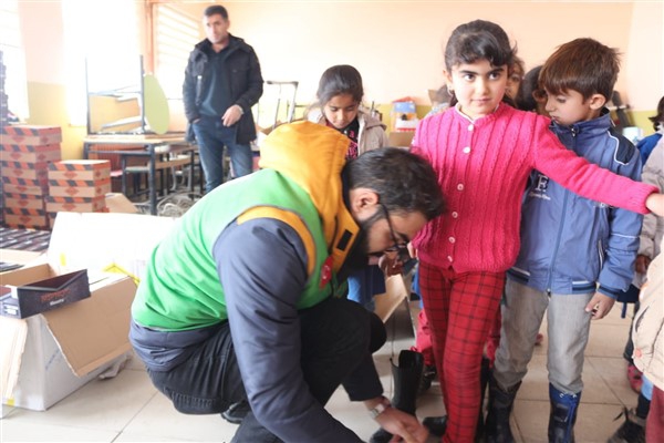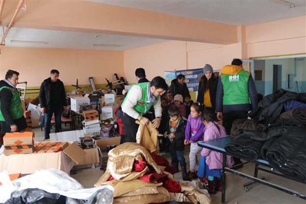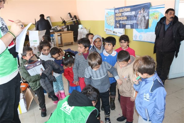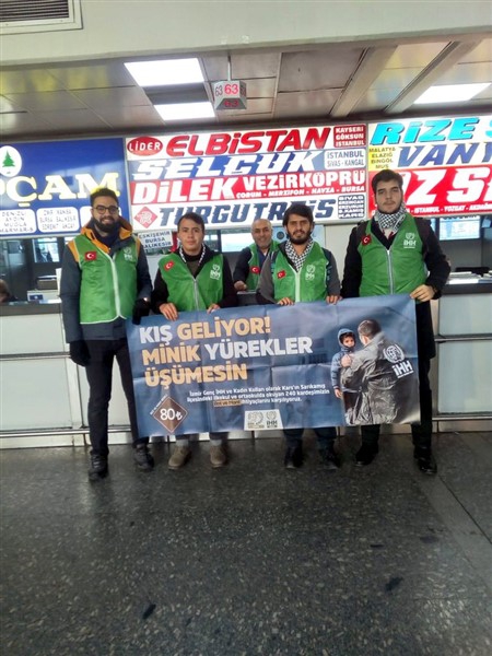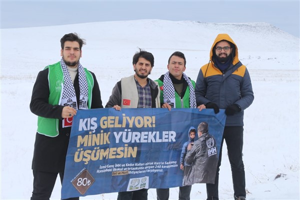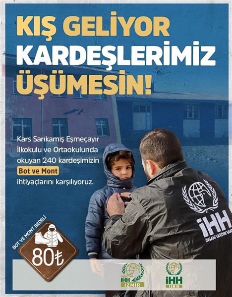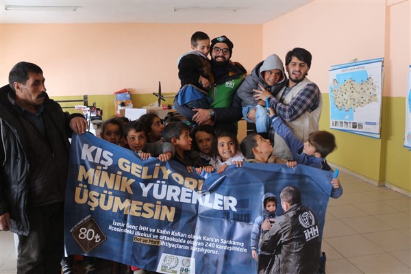 İzmir Genç İHH ve Kadın Kolları, İzmir'de başlattıkları "Minik Yürekler Üşümesin" projesi kapsamında lise ve üniversitedeki gönüllülerle yaptığı çalışmayla tespit edilen Kars Sarıkamış Eşmeçayır İlkokul ve Ortaokulunda 240 minik öğrenciye bot ve mont dağıttı.