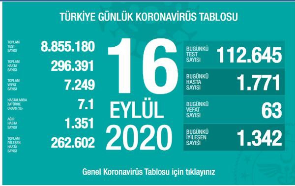 Günlük koronavirüs tablosuna göre; bugün 1771 yeni vaka tespit edildi, 63 hasta hayatını kaybetti, 1342 hasta iyileşti. Ağır hasta sayısı 1351'e yükseldi.