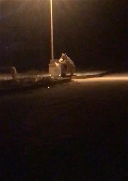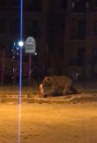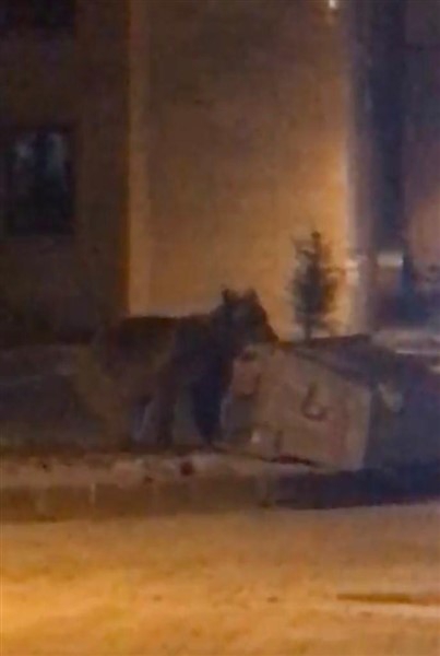 Kars’ın Sarıkamış İlçesi’nde aç kalan boz ayılar, ilçe merkezine kadar inerek çöp konteynerlerinde yiyecek arıyor.