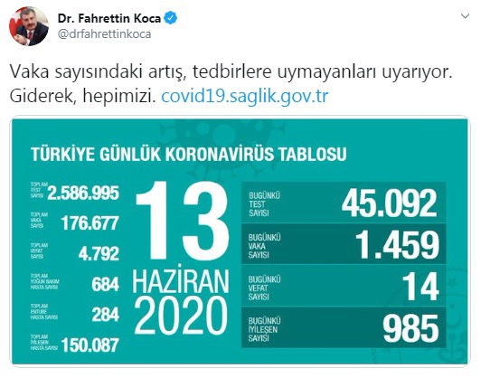 Türkiye Günlük Koronavirüs Tablosu'nu göre; son 24 saatte 45 bin 92 test yapıldı, 1459 kişiye daha koronavirüs teşhisi konuldu. Virüs nedeniyle 14 kişi yaşamını yitirirken, 985 kişi de iyileşti. Bügünkü verilerle, toplam test sayısı 2 milyon 586 bin 995, toplam vaka sayısı 176 bin 677, toplam vefat sayısı 4 bin 792, toplam yoğun bakım hasta sayısı 684, solunum cihazına bağlı toplam hasta sayısı 284, toplam iyileşen hasta sayısı 150 bin 87 oldu.