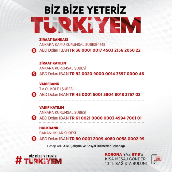 Corona virüsüne karşı ekonomik dayanışma kapsamında Cumhurbaşkanı Erdoğan'ın duyurduğu "Biz Bize Yeteriz Türkiyem Kampanyası"nın bankaların hesap numaraları ve iban bilgileri Aile, Çalışma ve Sosyal Hizmetler Bakanı Selçuk tarafından paylaşıldı. Corona Milli Dayanışma Kampanyası'nda katkı sağlayacak olan katılımcılar, banka hesapları üzerinden ya da 8119 SMS numarasından bağışlarını yapabilecekler.