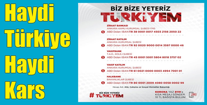 Kars Valiliği, “Biz Bize Yeteriz Türkiyem” Corona bağışı SMS ve hesap numarası - iban bilgilerini kamuoyuyla paylaştı.