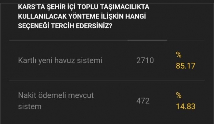 “Önümüzdeki günlerde ihalesini yaparak Kars’ın hak ettiği biçimde şehir içinde hizmet verilmesi için çalışmalarını yürüttüğümüz toplu taşımacılık konusunda uygulanacak yönteme ilişkin öngördüğümüz değişikliğe dair halkımızın da doğrudan görüşünü almak için cep telefonu üzerinden bugün gerçekleştirdiğimiz mobil anket sonuçlarının rakamsal ve grafik dağılımını Değerli Karslılar ile paylaşıyoruz.”
