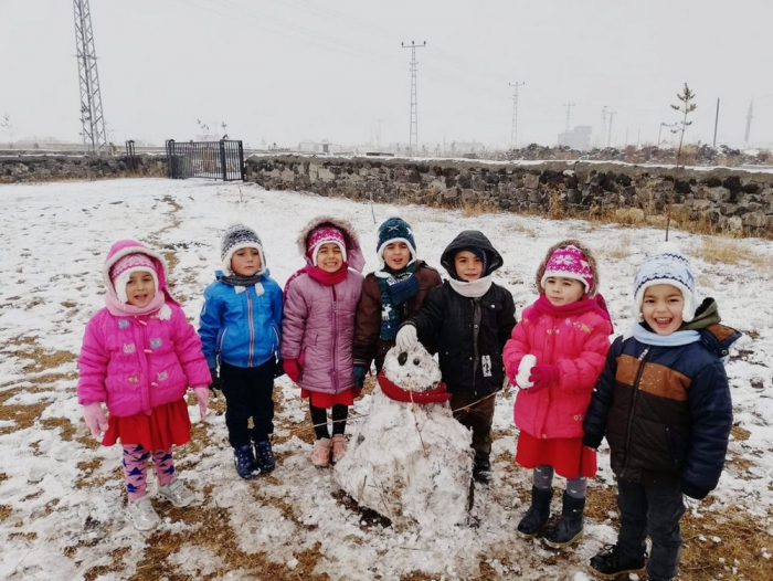 Kars’ın Akyaka İlçesi’ne bağlı Duraklı Köyü’nde minik öğrencilerin yaptıkları kardan adam etrafında verdikleri bu poz Kars’ın en güzel fotoğraf kareleri arasında yerini aldı.