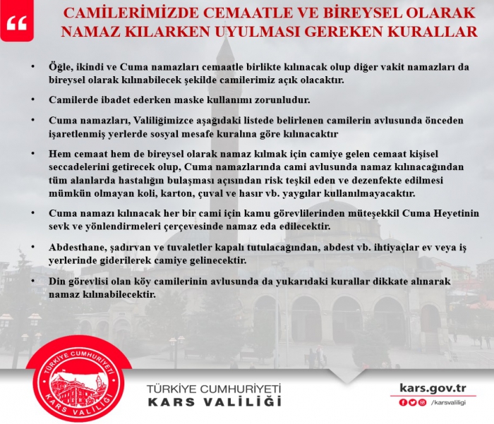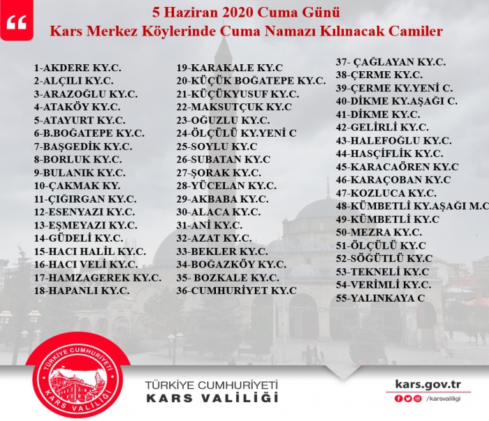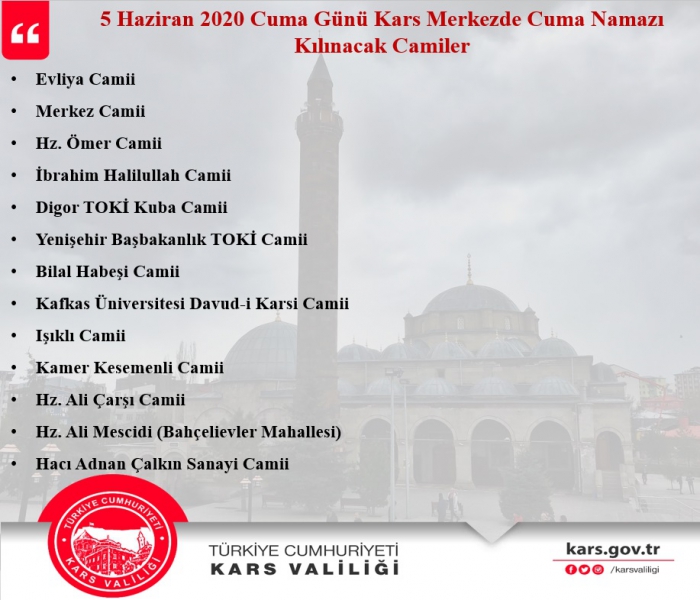 5 Haziran 2020 Cuma günü Kars il merkezi ve merkeze bağlı 68 camide Cuma namazı kılınabilecek.