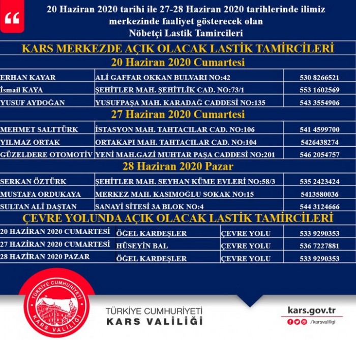 20 Haziran 2020 tarihi ile 27-28 Haziran 2020 tarihlerinde il merkezinde faaliyet gösterecek olan nöbetçi lastik tamircileri: