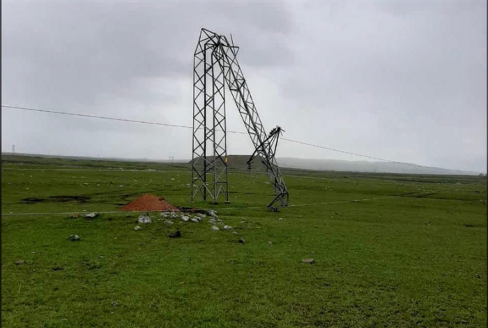 Kars’ın Arpaçay ilçesine bağlı Çanaksu köyünde etkili olan şiddetli fırtına yüksek gerilik hattının geçtiği demir elektrik direğini yere eğdi.