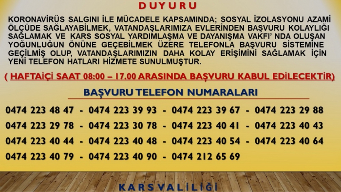 Kars Valiliği, “Vatandaşlarımıza kolaylık sağlamak ve Kars SYDV'de oluşan yoğunluğu önlemek amacıyla telefonla başvuru sistemine geçilmiş olup, vatandaşlarımızın daha kolay erişimini sağlamak için yeni telefon hatları hizmete sunulmuştur. Kamuoyuna saygıyla duyurulur.” açıklamasında bulundu.