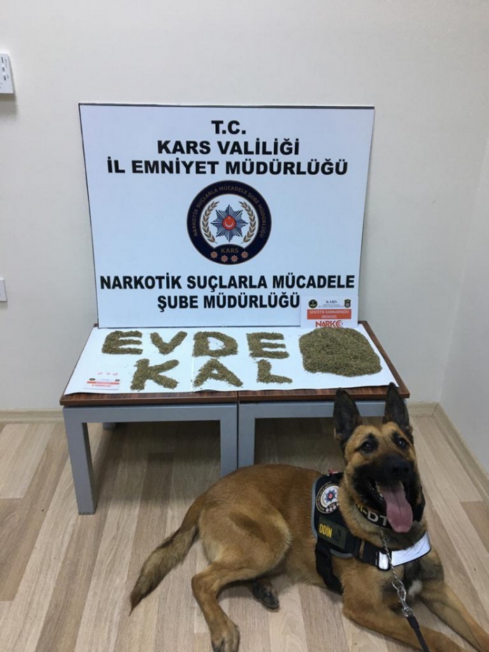 Kars'ta düzenlenen uyuşturucu operasyonunda 430 gram bonzai ve 3 ecstasy hap ele geçirildi. Narkotik köpeği Odi, ele geçirilen uyuşturucuyla yazılan 'Evde Kal' yazısı önünde poz verdi.