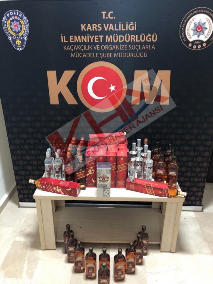Kars Emniyet Müdürlüğü Kaçakçılık ve Organize Suçlarla Mücadele (KOM) ekipleri tarafından piyasaya sürülmek üzere çok sayıda kaçak içki ele geçirdi.