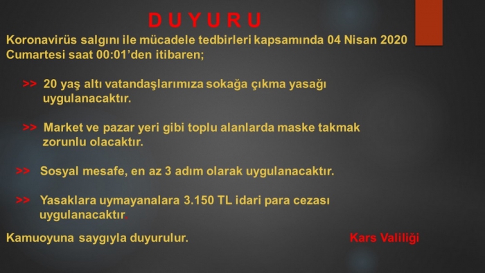 Kars Valiliği, “Koronavirüs salgını ile mücadele tedbirleri kapsamında 04 Nisan 2020 Cumartesi günü saat 00:01’den itibaren uygulanmak üzere yeni tedbirler alınmıştır. Yasaklara uymayanlara 3 bin 150 TL idari para cezası uygulanacaktır. Uygulamadaki tedbirlere titizlikle uyulmasını önemle rica ederiz.” açıklaması yaptı.