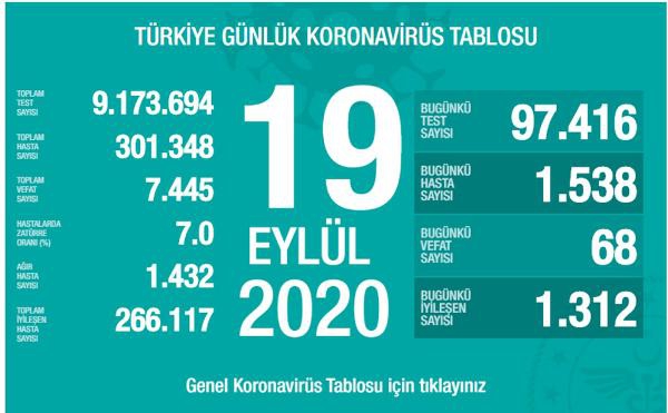 Sağlık Bakanı Fahrettin Koca, Twitter hesabından yaptığı paylaşımda, günlük koronavirüs tablosunun paylaşıldığı 'covid19.saglik.gov.tr' adresine yer verdi. Günlük koronavirüs tablosuna göre; son 24 saatte 97 bin 416 test yapıldı, 1538 kişide daha koronavirüs tespit edildi. Tedavi görenlerden 68 kişi hayatını kaybederken, 1312 kişi de iyileşti. Bugünkü verilerle, toplam test sayısı 9 milyon 173 bin 694, toplam hasta sayısı 301 bin 348, toplam vefat sayısı 7 bin 445, hastalarda zatürre oranı yüzde 7,0, ağır hasta sayısı 1432, toplam iyileşen hasta sayısı 266 bin 117 oldu.