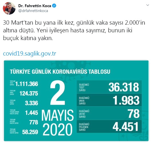 Sağlık Bakanı Fahrettin Koca'nın Twitter hesabından paylaştığı tabloya göre; bugün 36 bin 318 test yapıldı, 1983 yeni vaka tanısı konuldu. 78 kişi vefat etti ve 4 bin 451 kişi de iyileşerek taburcu oldu. Tabloda toplam test sayısı 1 milyon 111 bin 366, toplam vaka sayısı 124 bin 375, toplam vefat sayısı 3 bin 336, toplam yoğun bakım hasta sayısı 1445, toplam entübe hasta sayısı 778, toplam iyileşen hasta sayısı ise 58 bin 259 olarak açıklandı.