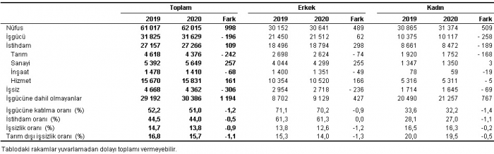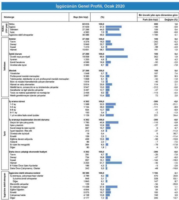 İşgücü 2020 yılı Ocak döneminde bir önceki yılın aynı dönemine göre 196 bin kişi azalarak 31 milyon 629 bin kişi, işgücüne katılma oranı ise 1,2 puanlık azalış ile %51,0 olarak gerçekleşti.