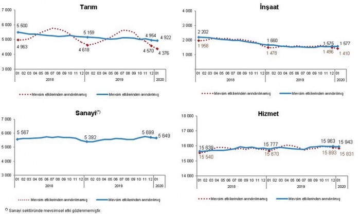 Bu dönemde, istihdam edilenlerin sayısı tarım sektöründe 242 bin, inşaat sektöründe 68 bin kişi azalırken, sanayi sektöründe 257 bin, hizmet sektöründe ise 161 bin kişi arttı. İstihdam edilenlerin %16,0'ı tarım, %20,7'si sanayi, %5,2'si inşaat, %58,1'i ise hizmet sektöründe yer aldı.