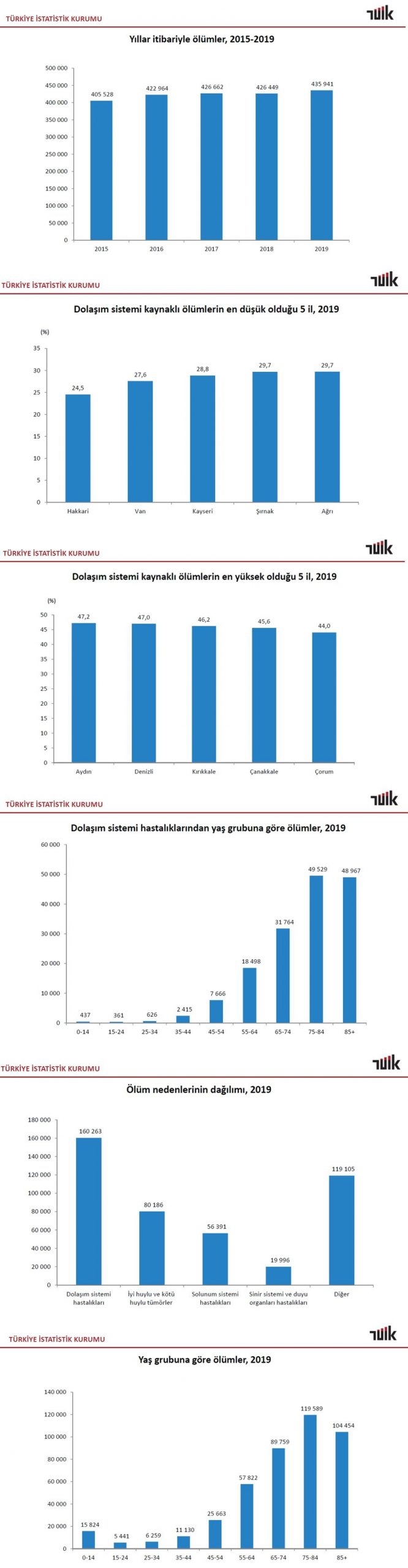 Türkiye İstatistik Kurumu (TÜİK), 2019 yılı ölüm ve ölüm nedeni istatistiklerini açıkladı. Verilere göre geçtiğimiz yıl boyunca Türkiye’de 435 bin 941 kişi çeşitli nedenlerle yaşamını yitirdi. Ölüm nedenleri arasında dolaşım sistemi hastalıkları 160 bin 263 kişi ile ilk sırada yer alırken, kanser ikinci, solunum yolu hastalıkları ise üçüncü oldu.