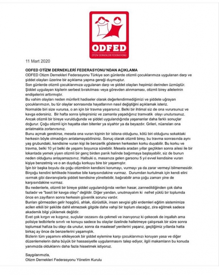Son günlerde otizmli çocuklarımıza uygulanan darp ve şiddet olayları üzerine bir açıklama yapma gereği duyulmuştur.. Hepimiz derinden üzüldük ve endişelerimiz arttı.. Bu olayları münferit hadiseler olarak değerlendirmiyoruz ve şiddete uğrayan çocuklarımızın hayatlarının ne şekilde değiştiğini açıklamak istiyoruz.