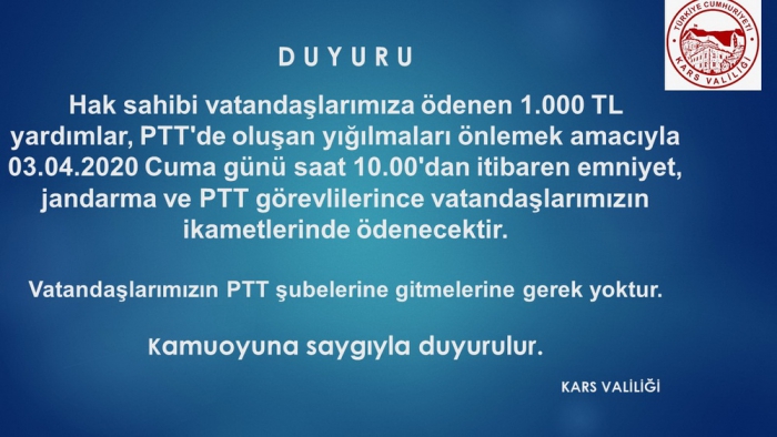 Kars Valiliği, “Hak sahibi vatandaşlarımıza ödenen 1.000 TL yardımlar, PTT'de oluşan yığılmaları önlemek amacıyla 03.04.2020 Cuma günü saat 10.00'dan itibaren emniyet, jandarma ve PTT görevlilerince vatandaşlarımızın ikametlerinde ödenecektir. Vatandaşlarımızın PTT şubelerine gitmelerine gerek yoktur. Kamuoyuna saygıyla duyurulur.” açıklamasında bulundu.