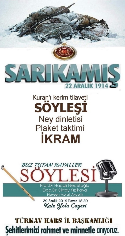 TÜRKAV Tarafından 29 Aralık 2019 Pazar günü saat:18 30'da Sarıkamış Harekatı'nın 105. Yıldönümü Münasebetiyle “Buz Tutan Hayaller” temalı söyleşi yapılacak.