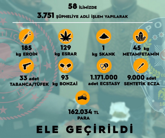 Türkiye’de 58 ilde son 7 gün içerisinde Emniyet Müdürlüğü Narkotik birimlerine gerçekleştirilen operasyonlarda 3 bin 751 adli işlem yapıldı.