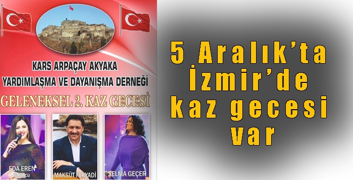 Kars Arpaçay Akyaka Yardımlaşma ve Dayanışma Derneği tarafından 5 Aralık 2021 Pazar günü saat: 18.00’de Tepe Sosyal Tesisleri Menemen İzmir adresinde Geleneksel Kaz Gecesi’nin ikincisi düzenlenecek.