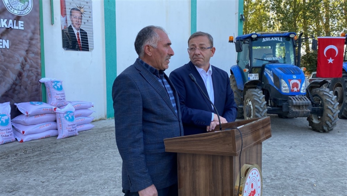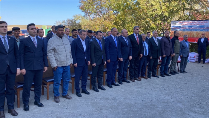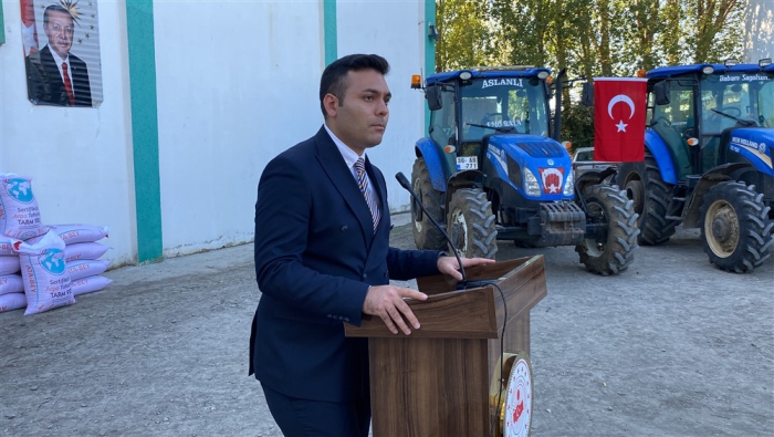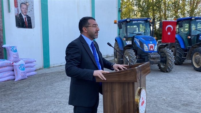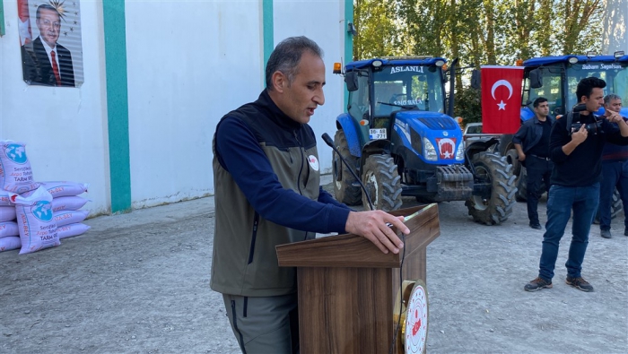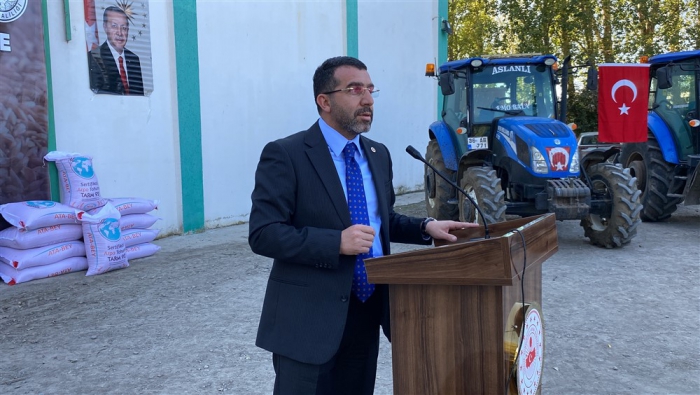 Saygı duruşu ve istiklal marşının ardından İl Tarım ve Orman Müdürü Enver Aydın bilgilendirme konuşması yaptı. Aydın, “İlimizde 2023 yılı üretim sezonu içerisinde birden fazla ve farklı dönemde dolu yağışı ve aşırı yağış sonrası sel su baskını yaşanarak üretim yapan çiftçilerimiz doğal afete maruz kalmıştır. İl Hasar Tespit Komisyonumuz tarafından ivedi olarak çalışmalar tamamlanarak toplamda 2436 afet mağduru için Cumhurbaşkanlığımızdan 5.000.000,00 TL acil yardım ödeneği Valiliğimizin hesabına yatırılmıştır. Ayrıca Sayın Valimizin İl Özel İdaresinden afetten zarar gören üreticilerimize destek olması amacıyla 1.785.000,00 TL ödenek tahsisi ile toplamda 6.785.000,00 TL’lik 570.150 kg Arpa tohumluğu alınmıştır. Afetlerden zarar gören üreticilerimize 10 dekar altında zararı olan üreticilerimize 100 kg 10 dekar üzeri zarar gören üreticilerimize ise 250 kg Arpa tohumluğu dağıtımı gerçekleşmektedir.” dedi.