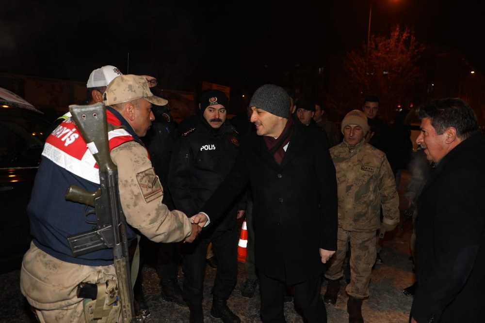 Kars Valisi Türker Öksüz, yılbaşı gecesi il emniyet müdürlüğü ve il jandarma komutanlığı tarafından ortak yürütülen güvenlik uygulamasını yerinde denetleyerek görev yapan güvenlik güçlerine başarılar diledi.