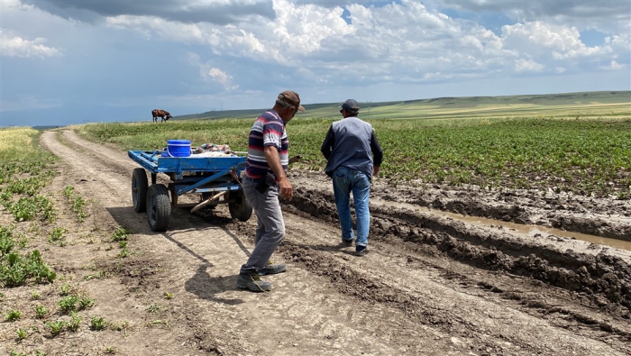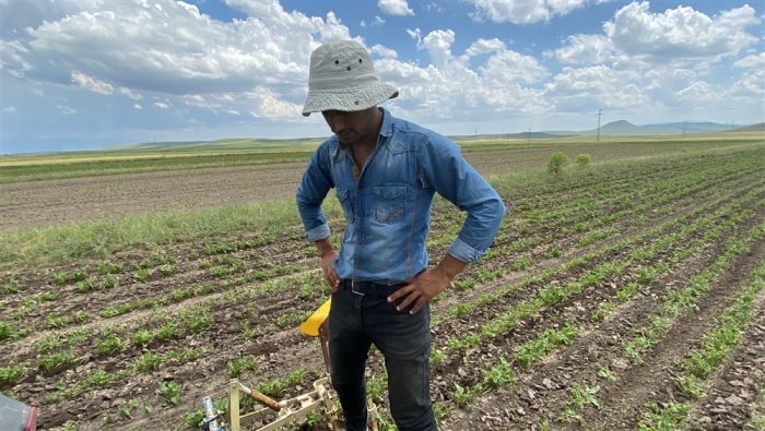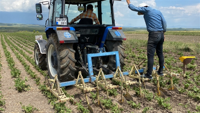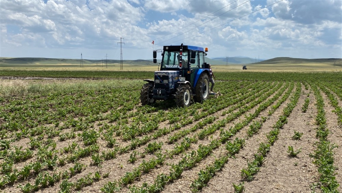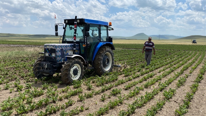 Pancar üretiminin yoğunlukta yapıldığı Kars'ın Akyaka ilçesinde bir süredir başlayan çapalama çalışması hummalı şekilde sürüyor. Karahan köyünde Mevlüt Elma ve ailesi de traktörle çapa yaptı. Ailece günlerini tarlada geçirerek yaptıkları çapayla doludan zarar gören pancarların yeniden hayat bulması için de çalışıyorlar.