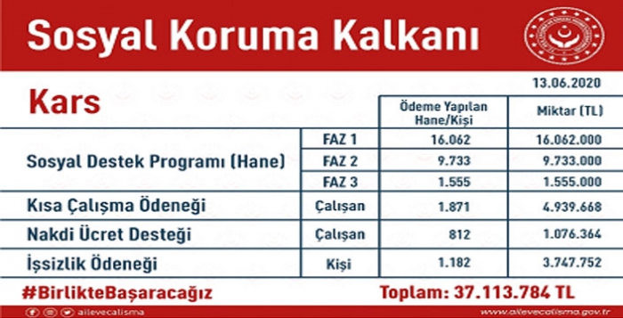 Açıklamada, “Yeni tip koronavirüsle (Covid-19) mücadele kapsamında Aile, Çalışma ve Sosyal Hizmetler Bakanlığı tarafından gerçekleştirilen “Sosyal Koruma Kalkanı” çalışması, hükümetimizin gecikmeden hayat geçirdiği hayati çalışmalardan biridir. Tüm Türkiye’de olduğu gibi, Serhad şehrimiz Kars’ta da “Sosyal Koruma Kalkanı” kapsamında ihtiyaç sahipleri için planlanan yardımlar yapılmaya devam ediyor. Aile, Çalışma ve Sosyal Hizmetler Bakanlığınca tarafımıza bildirilen Kars’taki ihtiyaç sahiplerine sağlanan yardımlar hayırlı olsun.”