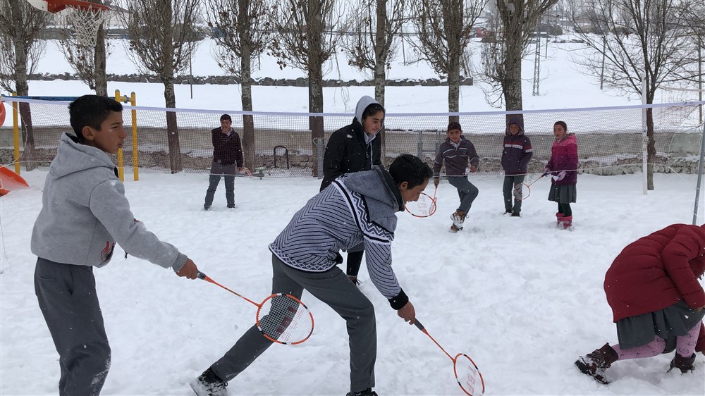 Karlı zeminde ilk defa badmintonla tanışan öğrenciler Badminton İl Temsilcisi Pınar Yağmur Toprak’tan Badminton’un nasıl oynandığını öğrendikten sonra ilk denemeyi yaptılar. Neşeli ve mutlu anlar yaşayan çocuklar ilgililere bu imkanı sundukları için teşekkür ettiler.