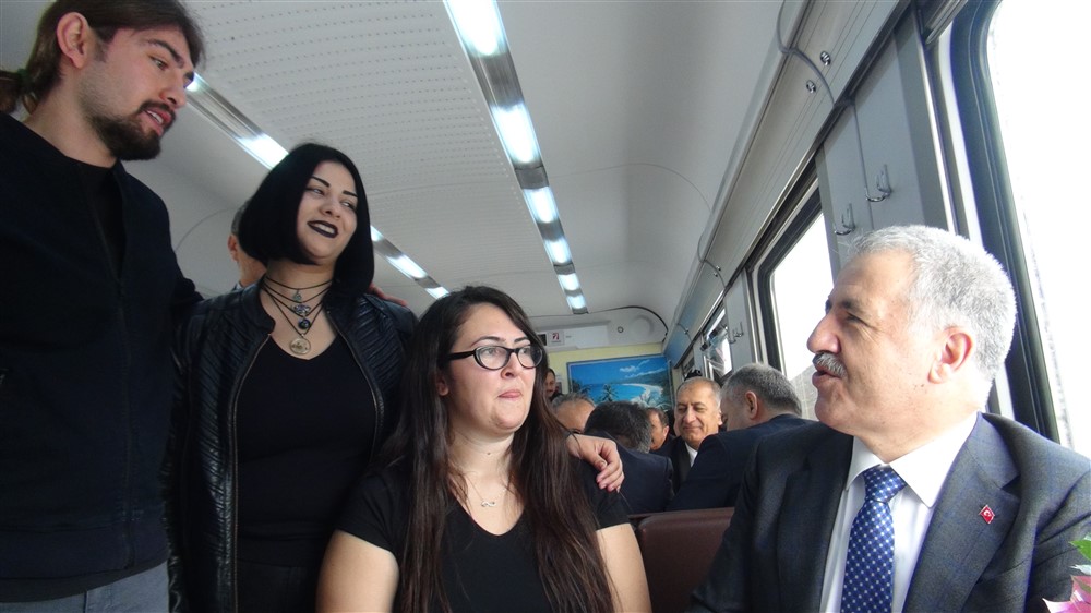 Bakan Arslan trende de yolcularla sohbetini sürdürdü. Trendeki çocuklarla yakından ilgilenen bakan Arslan yolcularla tek tek sohbet edip duygu ve düşüncelerini aldı. Kars’ın tarihi dokusunu, Ani Harabeleri, Sarıkamış Çıldır Gölü, Kars Kalesi gezisi yaptıklarını öğrenen Bakan Arslan, Doğu Ekspresiyle yolculuğun nasıl olduğunu da sordu. Yolcular, Doğu Ekspresinden çok memnun olduklarını, bilet bulmakta zorlandıklarını belirttiler. Bakan Arslan da bir dizi yenilik getirdiklerini, vagon sayılarını artırdıklarını ve konfora da önem verdiklerini ifade etti.