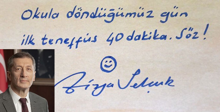 Bakan Selçuk, “Çocuklar evde sıkıldığınızı, okulu özlediğinizi biliyorum. Buradan söz olsun, okula döndüğümüz ilk günün ilk teneffüsünü, o güne özel olarak 40 dakika yapacağız.” dedi.