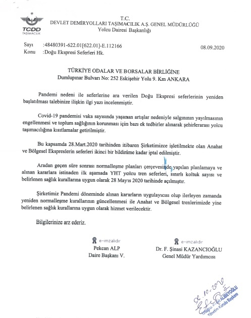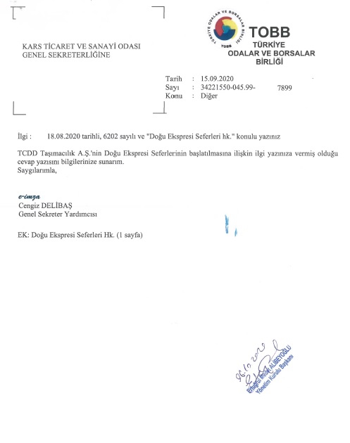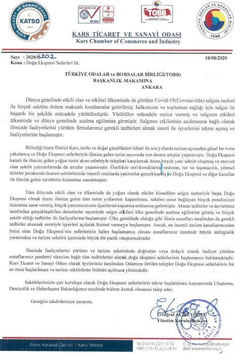 “Doğu Ekspresi seferlerinin tekrar başlaması yönünde KATSO olarak başta Ulaştırma ve Altyapı Bakanlığı olmak üzere Türkiye Odalar ve Borsalar Birliği(TOBB) ve Devlet Demiryolları’na raporumuzu ilettik. İlgili kurum ve kuruluşlardan alınan cevabi yazı “ilerleyen süreçlerde sağlık kuralları çerçevesinde seferlerin tekrar başlayacağı yönündedir.” Kars Ticaret ve Sanayi Odası olarak konunu takipçisi olacağız ve turizm sektörüne umut bağlayan üyelerimiz için üzerimizde düşen vazifeleri yerine getireceğiz” Diyerek sözlerini sonlandırdı.