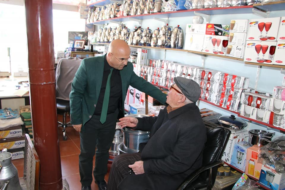 Belediyenin çalışmaları hakkında bilgi veriyor, esnafların görüşlerini alıyor.