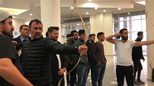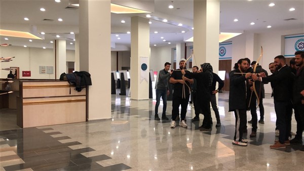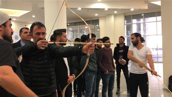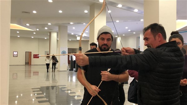 Okçular Vakfı Yönetim Kurulu Başkanı Haydar Ali Yıldız’ın sergi hakkında protokol üyelerine bilgi vermesinin ardından ok atışı da yapan protokol daha sonra paneli izlemek için salona geçti.