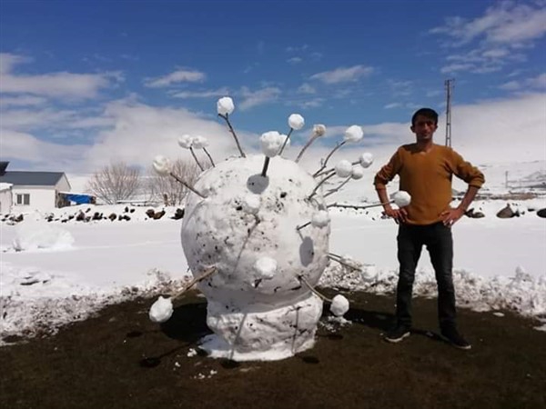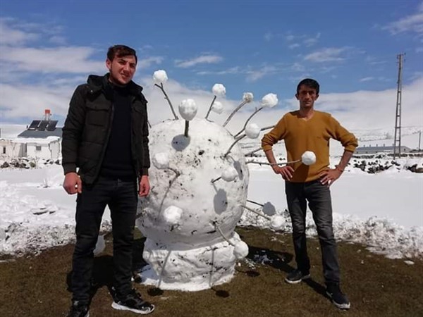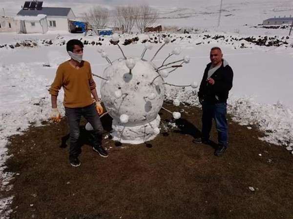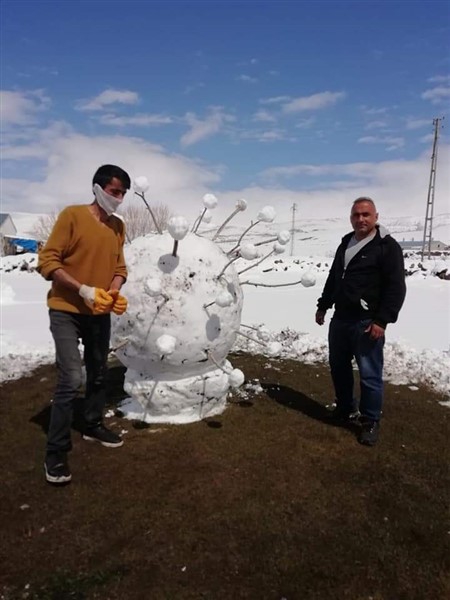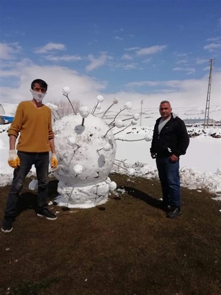Çıldır ilçesinin 320 nüfuslu Yukarı Cambaz köyünde yaşayan çocukluk arkadaşları Bülent Koçak ve Volkan Çolak, yağan karı fırsat bilip kardan koronavirüs yaptı. Arkadaşların 1 metre 60 santimetre boyunda, 1 metre 20 santimetre genişliğinde, 20 dakikada yaptıkları kardan koronavirüs, güneş çıktıktan 2 saat sonra eridi. İkili cep telefonuna kaydettikleri görüntüleri sosyal medyadan paylaştı.