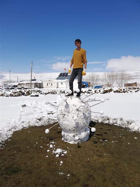 İnşaat işçisi Bülent Çolak, "Koronavirüs nedeniyle köyümdeki evime geldim. Salgın bitene kadar köyümden çıkmayı düşünmüyorum. Lapa lapa kar yağıyordu. Bir süre önce kardan adam yapmıştık. Bu sefer de koronavirüs yapmaya karar verdik. Sosyal medyada paylaşınca büyük ilgi gördü. Fakat 2 saat sonra güneş nedeniyle eridi. Umarız koronavirüs de tez zamanda yok olup, gider."