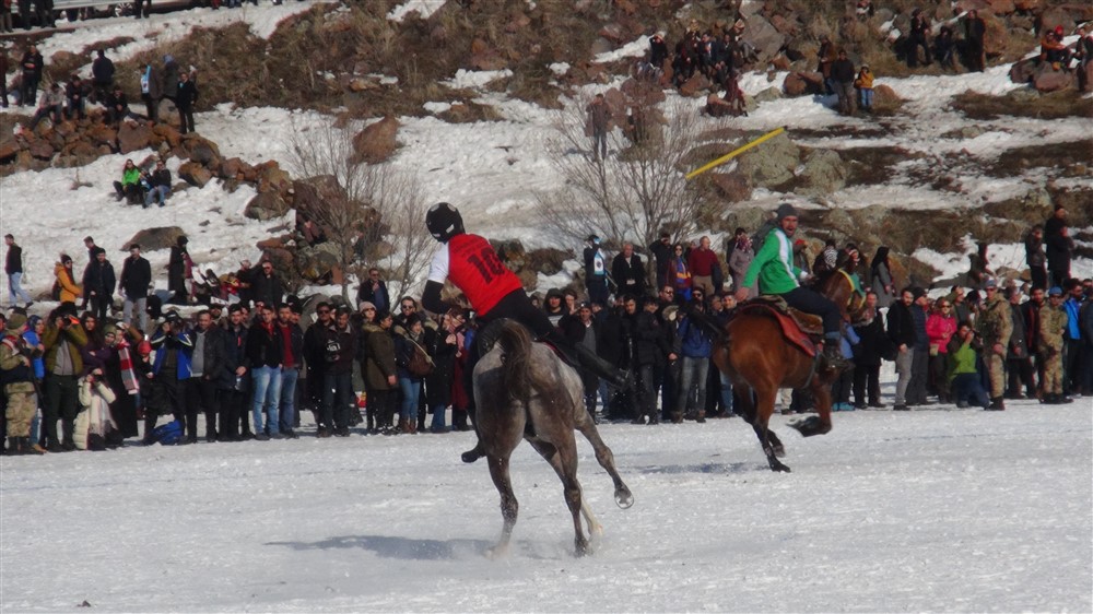 Ardahan’da bu yıl 5’incisi düzenlenen Çıldır Kristal Göl Uluslararası Kış Şöleninde düzenlenen atlı yarışlar heyecanlı anlar yaşattı. Atlı kızak ve dört nal yarışları ile cirit müsabakalarında buzlu zeminde kayan atlardan düşen sporcular yürekleri ağızlara getirdi. Kırgız sporcuların sergilediği Gökbörü oyunu ise adeta nefesleri kesti.