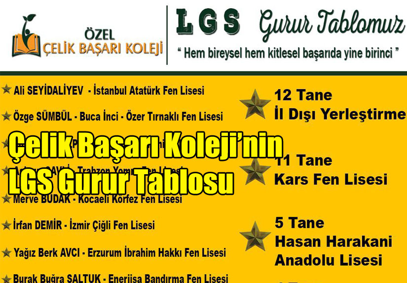 Kars’ın önde gelen özel okullarından Çelik Başarı Koleji bu yıl da LGS’deki başarısını ortaya koydu. Eğitimdeki başarı çıtasını her geçen yıl daha da üst sıralara taşıyan Çelik başarı Koleji’nin gurur tablosu Karslıları da gururlandırdı.