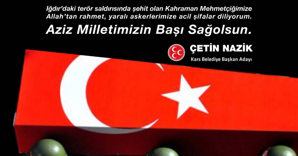 MHP Kars Belediye Başkan Adayı Çetin Nazik, “Iğdır'ın Aralık ilçesinde terör saldırısı sonucu şehit olan Kahraman Mehmetçiğimize Allah’tan rahmet, yaralı askerlerimize acil şifalar diliyorum. Aziz Milletimizin Başı Sağ Olsun.” dedi.
