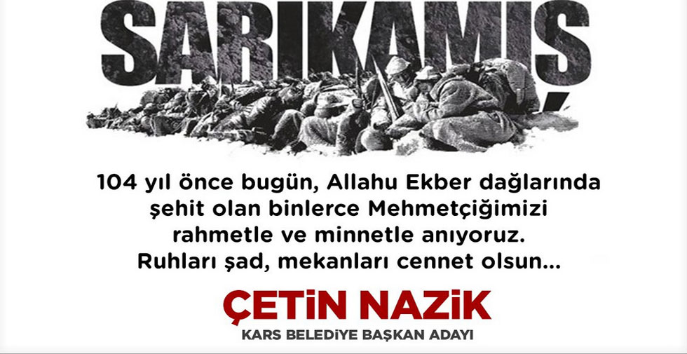 Milliyetçi Hareket Partisi (MHP) Kars Belediye Başkan Adayı İşadamı Çetin Nazik, Sarıkamış Şehitlerini Anma Günü dolayısıyla bir mesaj yayınladı.