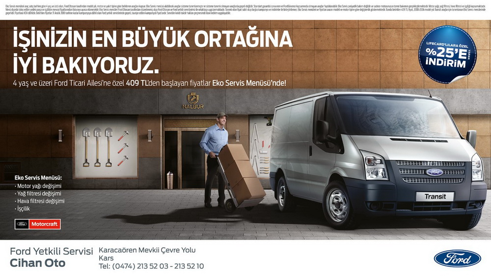“İŞİNİZİN EN BÜYÜK ORTAĞINA İYİ BAKIYORUZ” sloganıyla; 4 YAŞ VE ÜZERİ FORD TİCARİ AİLESİNE ÖZEL 409 TL’DEN BAŞLAYAN FİYATLAR EKO SERVİS MENÜSÜ’NDE