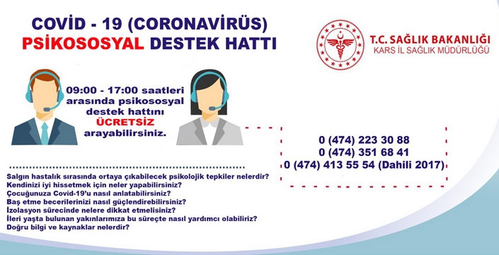 Gibi konularda ilimizde, İl sağlık Müdürlüğü’müze bağlı Merkez Sağlıklı Hayat Merkezi’nde 0(474)223 30 88, Kağızman Devlet Hastanesi’nde 0(474)351 68 41 ve Sarıkamış Devlet Hastanesi’nde 0(474)413 55 54/2017 numaraları aranarak Psikososyal Destek Hattı üzerinden ücretsiz bilgi ve hizmet vermektedir.