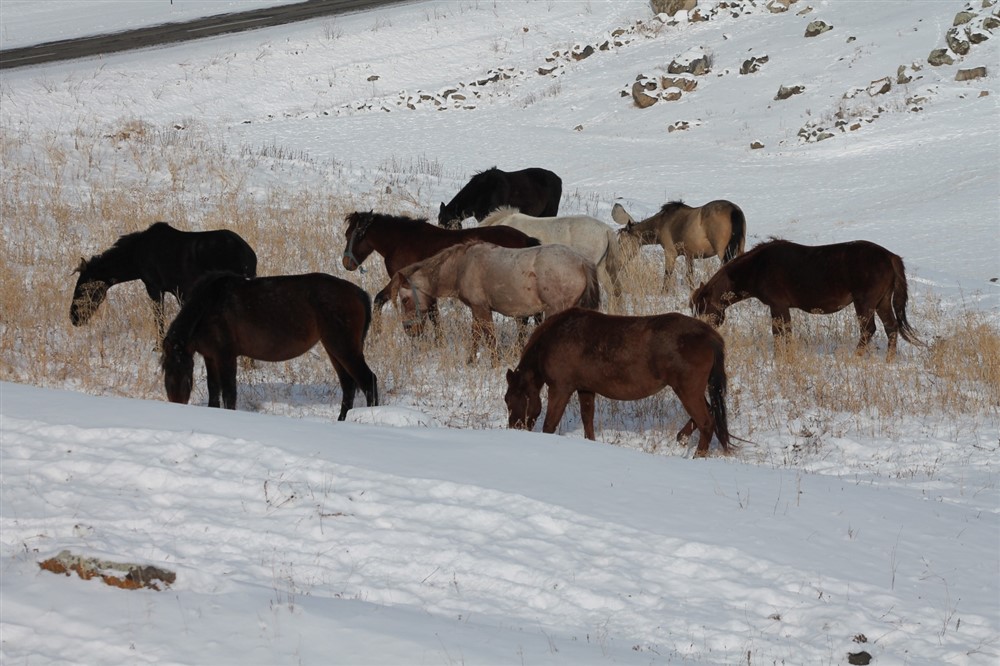 Bölgeye yağan karla birlikte aç-susuz çölde başıboş dolaşan atlar karayollarında çeşitli kazalara da sebebiyet vermekte.