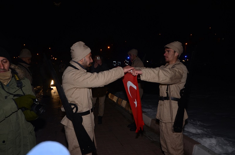 Sarıkamış kent merkezinde bir araya gelen asker kıyafeti giyen ve ellerine Türk bayrakları ile meşale alan yaklaşık 300 öğrenci, eksi 12 derece sıcaklıkta Yukarı Sarıkamış Şehitlik Anıta kadar yaklaşık 3 kilometre yürüdüler.