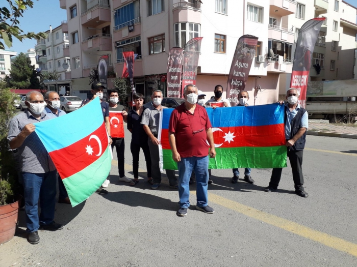 Türk ve Azerbaycan bayraklarıyla açıklama yapan Azerbaycan vatandaşları ”Azerbaycan’ın yanındayız. Ermeni saldırılarını kınıyoruz, Ermenilere gereken ders verilmelidir “dediler.