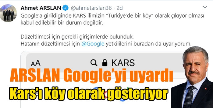 Arslan, “Google’a girildiğinde KARS ilimizin “Türkiye’de bir köy” olarak çıkıyor olması kabul edilebilir bir durum değildir. Düzeltilmesi için gerekli girişimlerde bulunduk. Hatanın düzeltilmesi için Google yetkililerini buradan da uyarıyorum.” dedi.