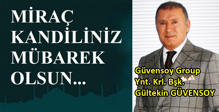 Güvensoy Group Yönetim Kurulu Başkanı Gültekin Güvensoy, Miraç Kandili’nin, Üç Aylar’ın feyz ve bereket kapılarından birisi olduğunu vurgulayarak, “Miraç, mana âleminde yükselmek demektir, yücelmek demektir. İlahi bir lütuftur, izzettir, ikramdır, ihsandır. Niyazımız odur ki; türlü sıkıntılarla karşı karşıya kaldığımız bu dönemde Yüce Allah, huzurumuzu, sağlımızı, sıhhatimizi, esenliğimizi, birlik ve beraberliğimizi zirvelere ulaştırsın” ifadelerini kullandı.