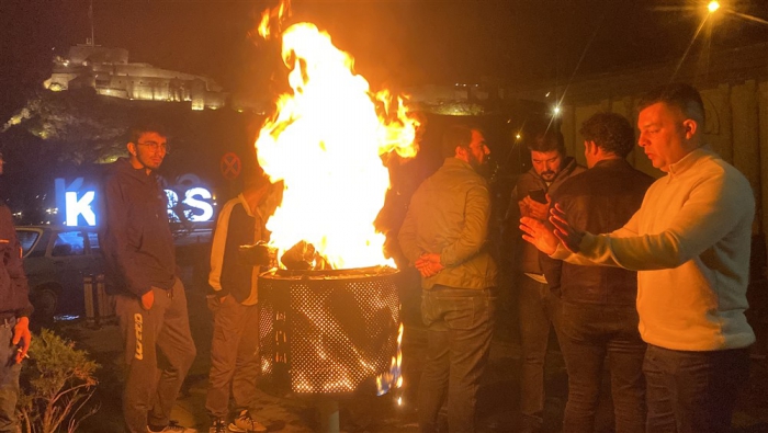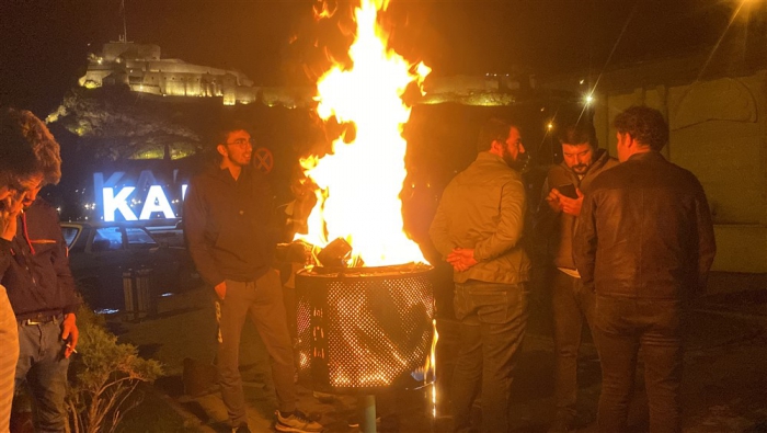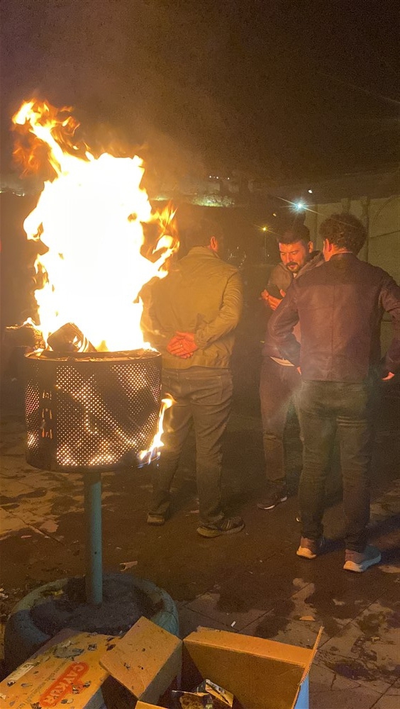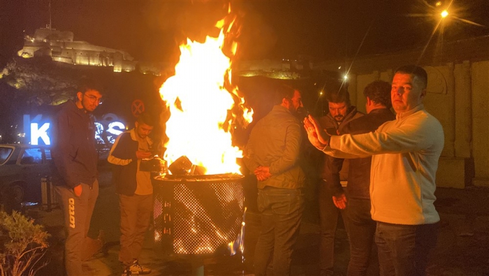 Geceleri kabanlarını yeniden giyinerek yürüyüşe çıkanlar yakılan ateşlerin etrafında ısınma molası veriyorlar.