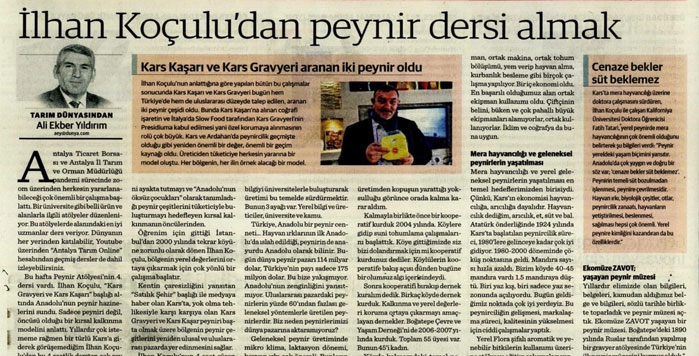 Özetle, İlhan Koçulu ve ekibi, Kars’ta hayvancılık yapan üreticilerin Türkiye’ye, dünyaya örnek olacak kırsal kalkınma modelinin çok az bir bölümüne yer verebiliyoruz. Herkesin ders alacağı bir model... Yazıyı, İlhan Koçulu’nun sık sık tekrarladığı bir sözle bitirelim, “gıdanız şifanız olsun”. Son olarak siz okurlarıma Antalya İl Tarım ve Orman Koordinasyon ve Tarımsal Veriler Şube Müdürü İbrahim Irmak’ın koordinasyonunda, ElifAkkaya, Çağla Seda Dicleli, Hazal Okat’ın hazırlayıp sunduğu tarım atölyelerini izlemenizi öneriyorum.